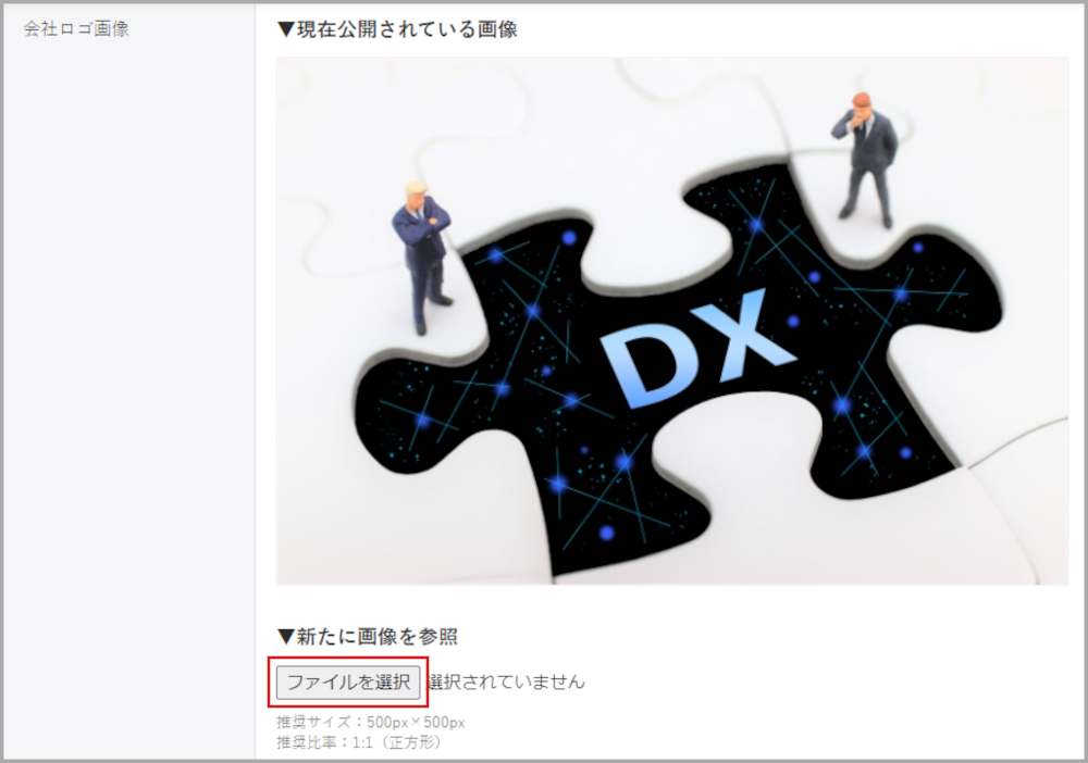 中下段あたりまでスクロール頂くと、会社ロゴ画像や会社イメージ画像のアップロードボタン(下記「ファイルを選択」)が出現致しますので、そこからアップロードしてください。