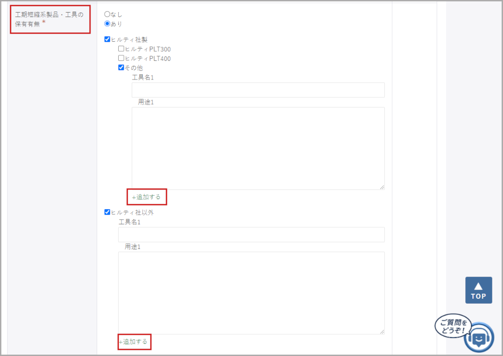 中ほどまでスクロール頂くと、「工期短縮系製品・工具の保有有無」の入力欄が出現致しますので、そこから工具名や用途を入力頂きます。